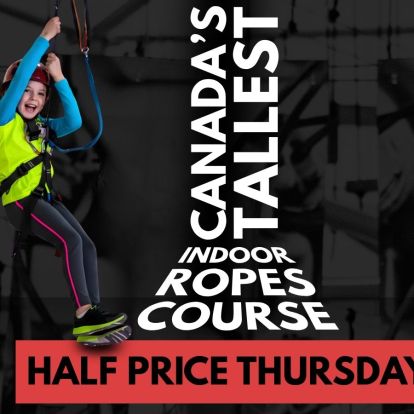Enjoy Half Price on the Unlimited High Ropes & Ziplines! Push your limits and take on our High Ropes & Ziplines course featuring 88 rope obstacles and heights soaring up to 75 feet. It’s time to test yourself and take your adventure to new heights! Every Thursday from 3 PM to Close